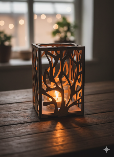 - Ljuslyktan Saga – Handgjord ljuslykta i trämaterial.- Handgjord ljuslykta i trämaterial med lövmotiv.