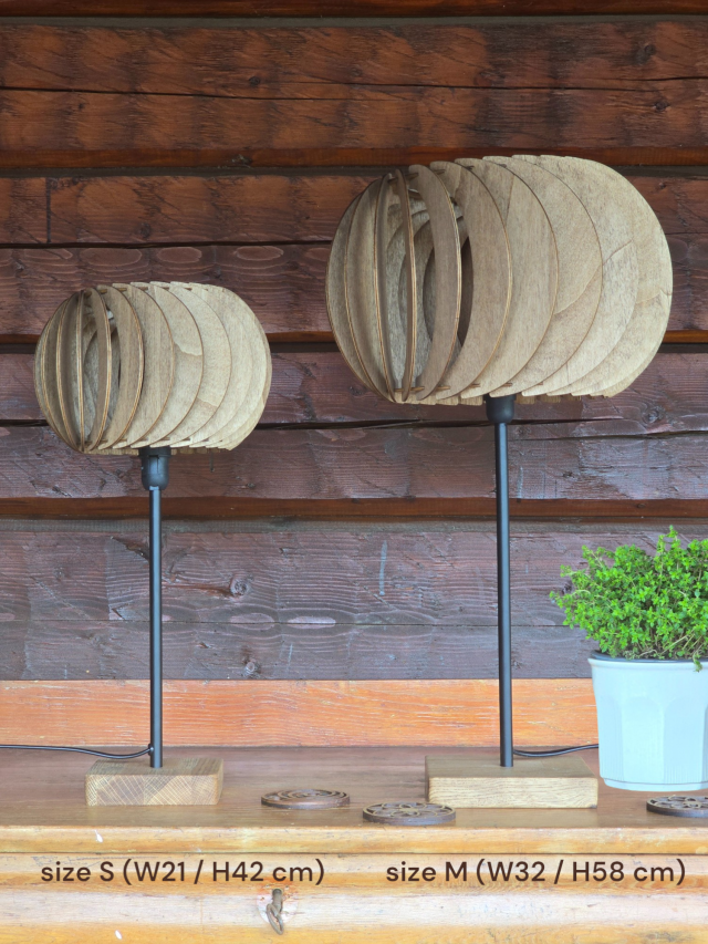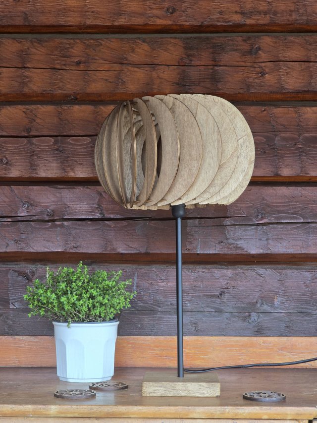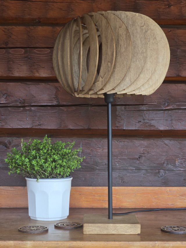 - Material: Lampfot i massiv ek, lampskärm i 3 mm träfanér