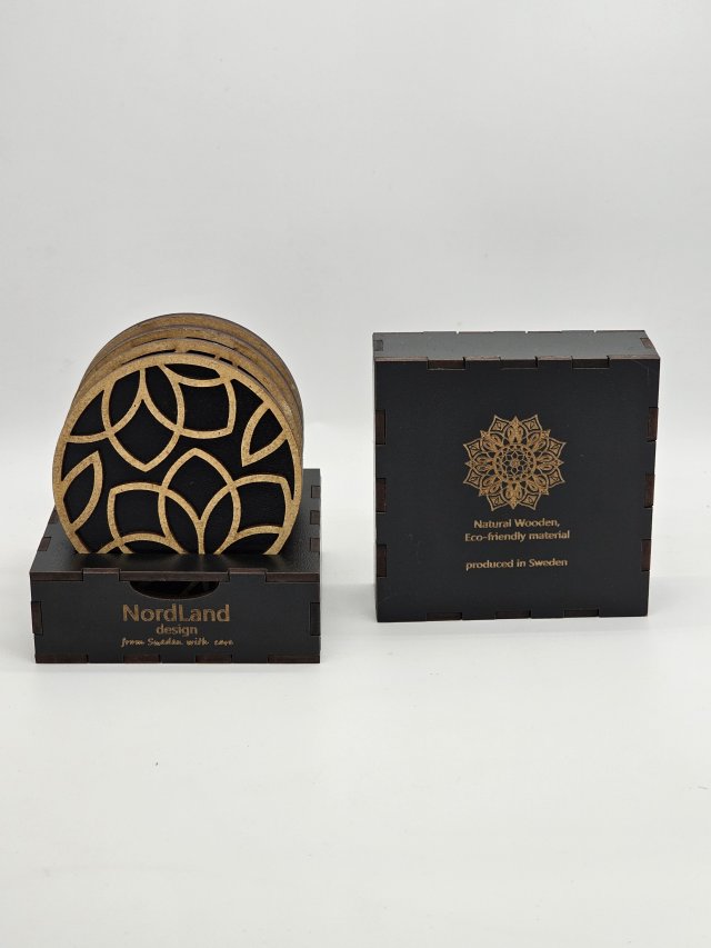 Setet levereras i en matchande träbox som är lika genomtänkt som underläggen själva.