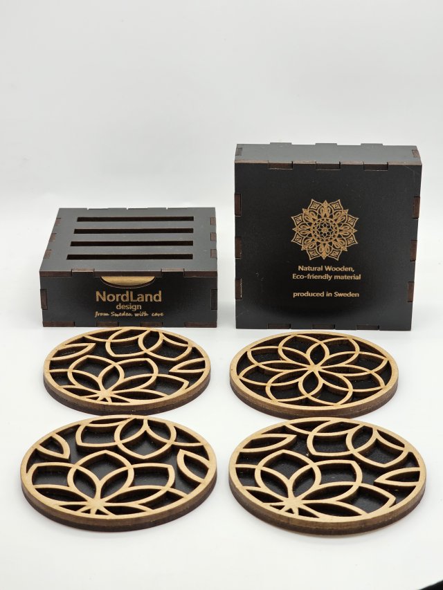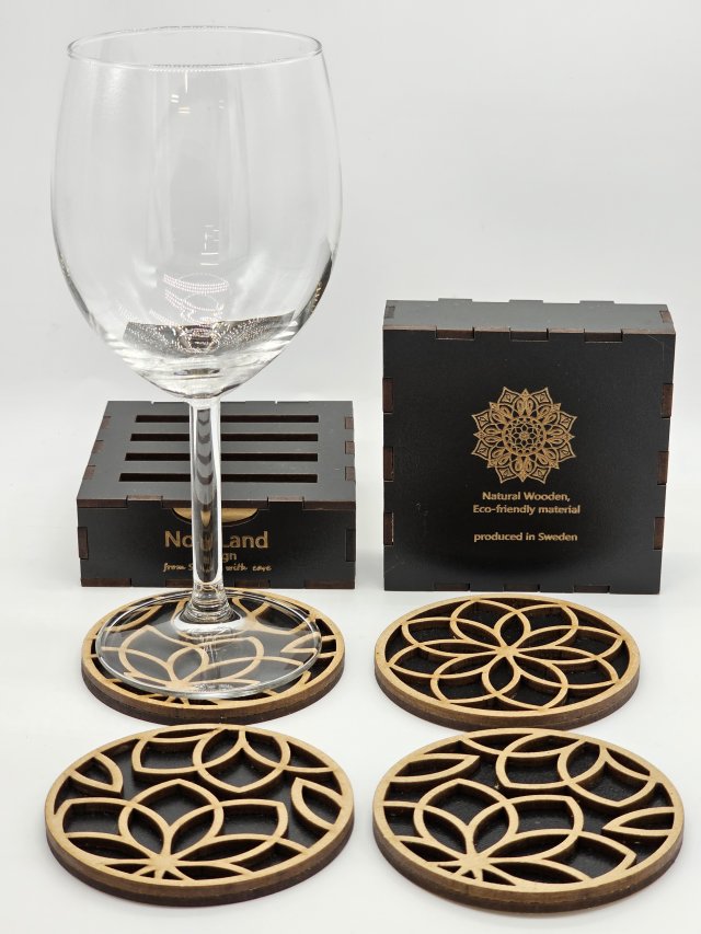 Eleganta glasunderlägg i naturligt pressade träfibrer med utskuret mönster.