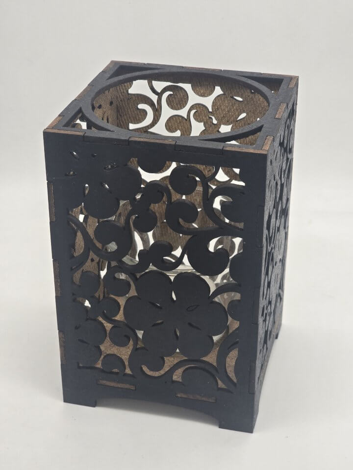 Varje ljuslykta tillverkas noggrant i vår egen verkstad där hantverk och modern design möts. Träet laserskärs med precision och kompletteras med en glaskopp som skyddar träet och ger ett säkert, mjukt sken.