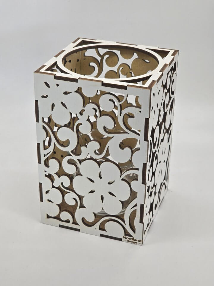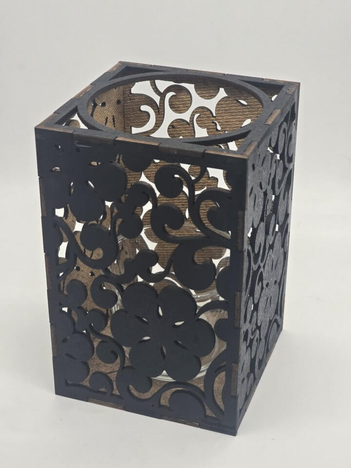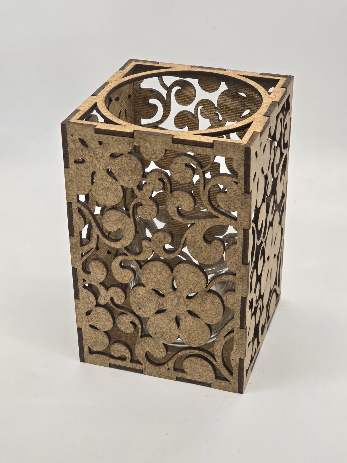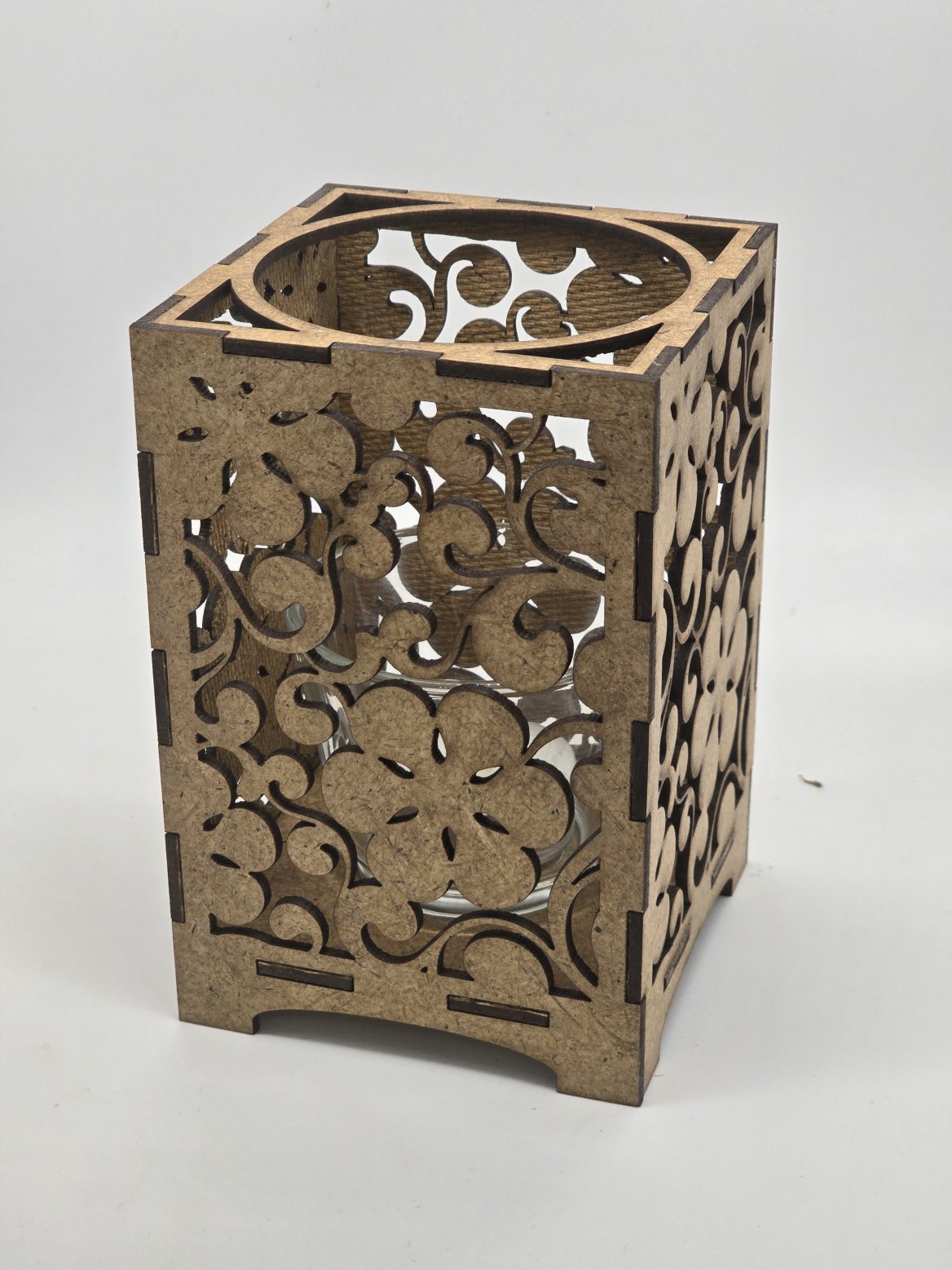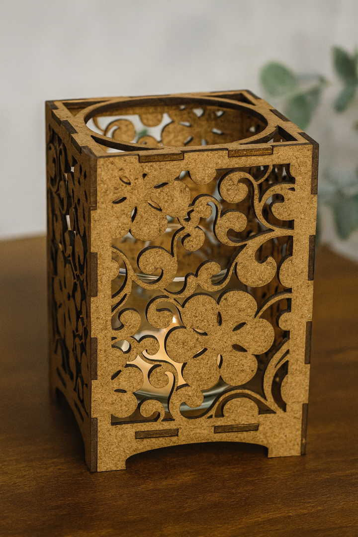 Hantverksgjord ljuslykta i trä med blommotiv.