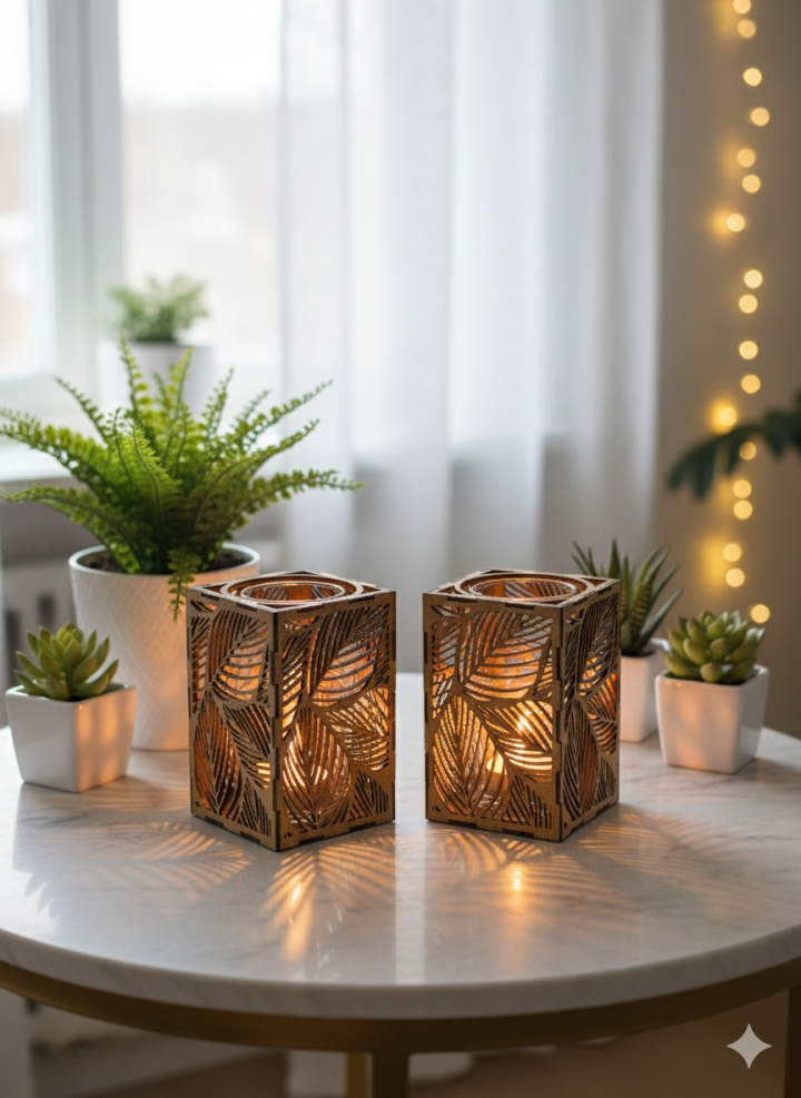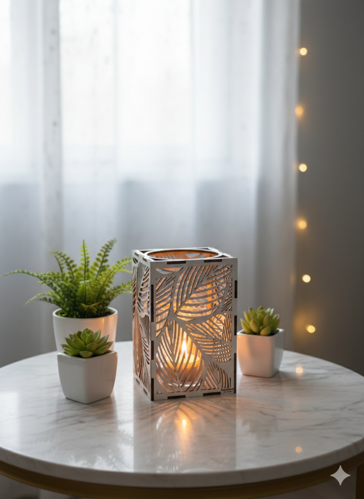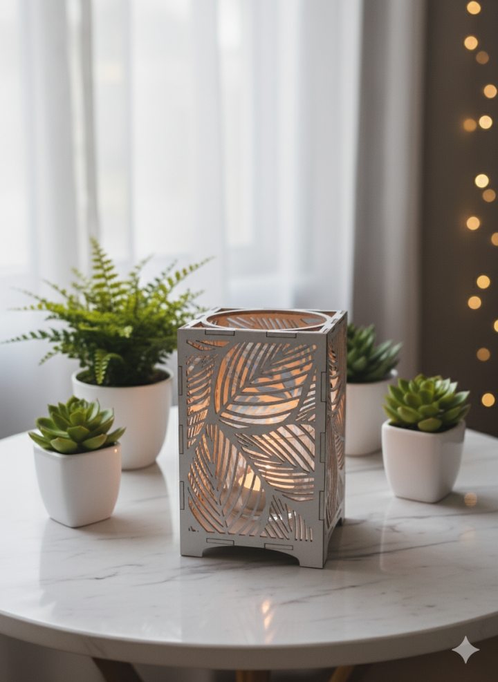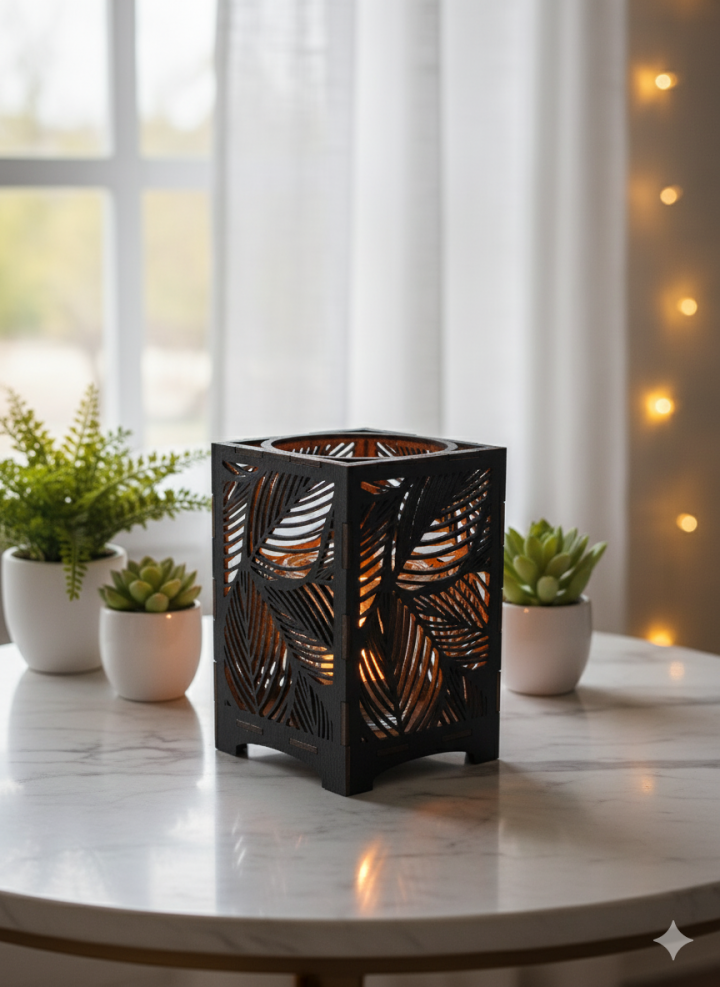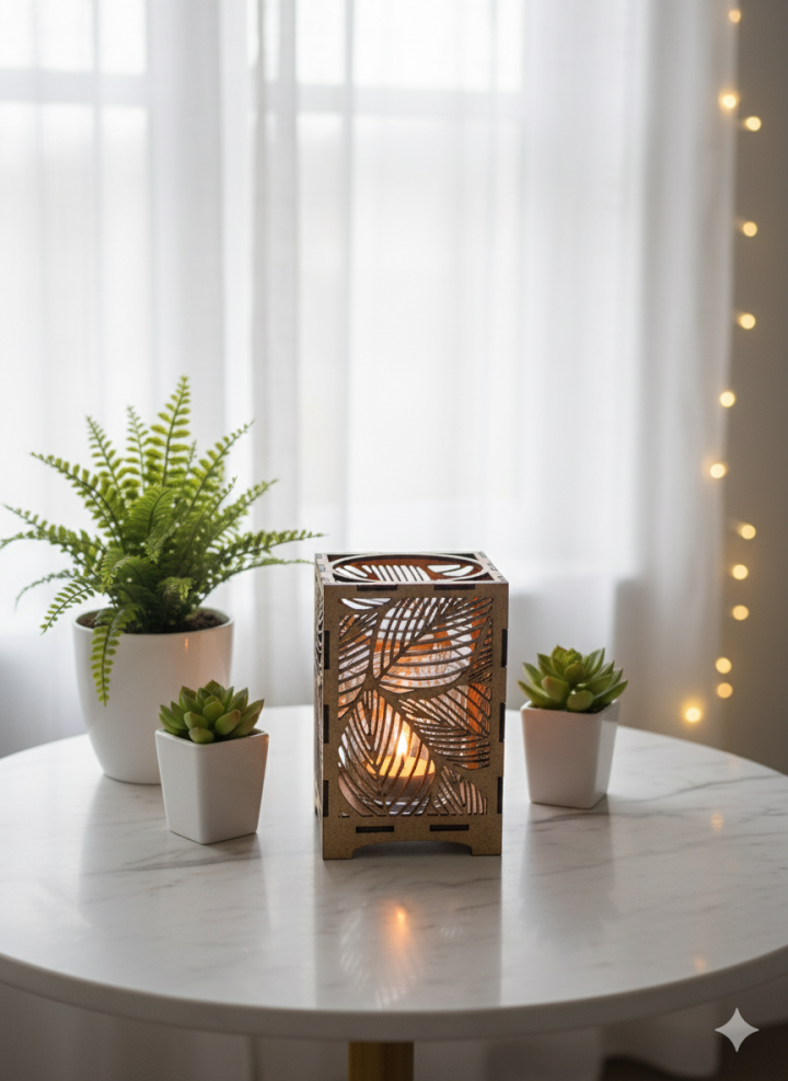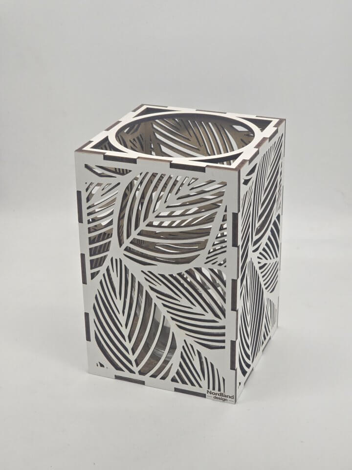 Ljuslyktan Saga är en handgjord ljuslykta i trämaterial med ett vackert lövmotiv som för tankarna till naturens stillhet och skogens mjuka rörelser.