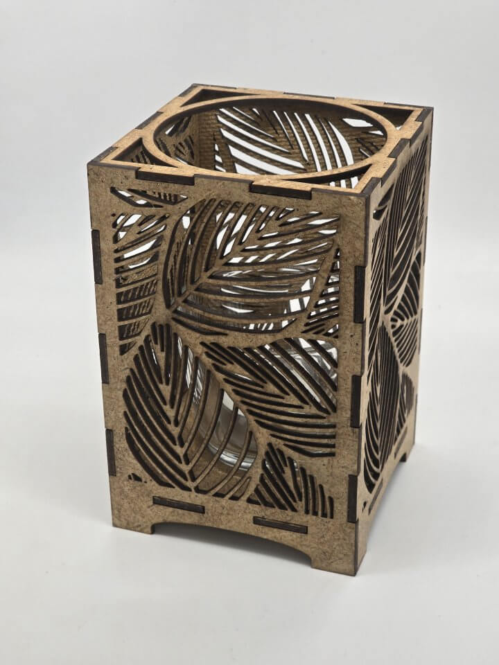 Handgjord ljuslykta i trämaterial med lövmotiv.